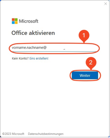 | Wie im Bild zu sehen, wird hier der Account, in Form der FeU-E-Mailadresse, eingetragen (1). Mit "Weiter" (2) bestätigen |  |