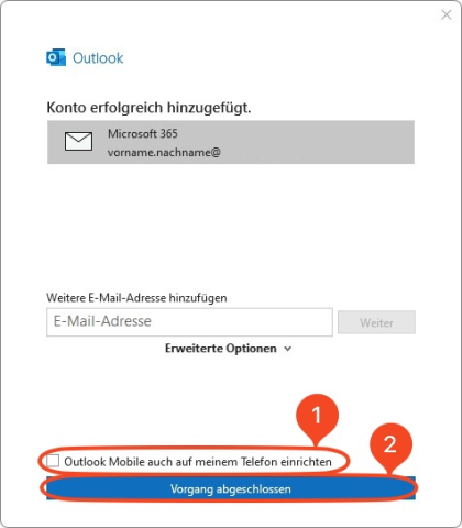 | Das Fenster bestätigt, dass das Konto erfolgreich hinzugefügt ist. Nachdem sichergestellt wurde, dass der Haken bei "Outlook Mobile auch auf meinem Telefon einrichten" (1) nicht aktiviert ist, kann der der Vorgang abgeschlossen werden (2). |  |