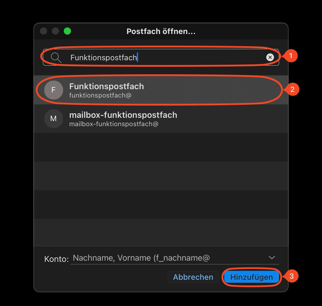 - Auf Hinzufügen klicken und die E-Mail-Adresse des Funktionspostfachs eingeben.